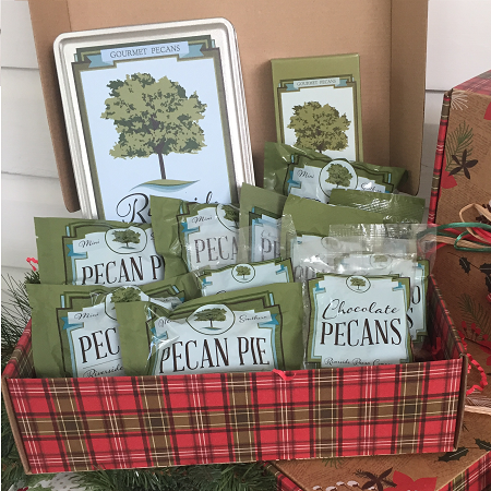 Our Simply Festive Box includes a decorator tin of cinnamon pecans, a 6 oz. box of butter roasted pecans, 4 pies, 2 pralines, 1 cluster, and 1 snack sized bag of chocolate pecans.